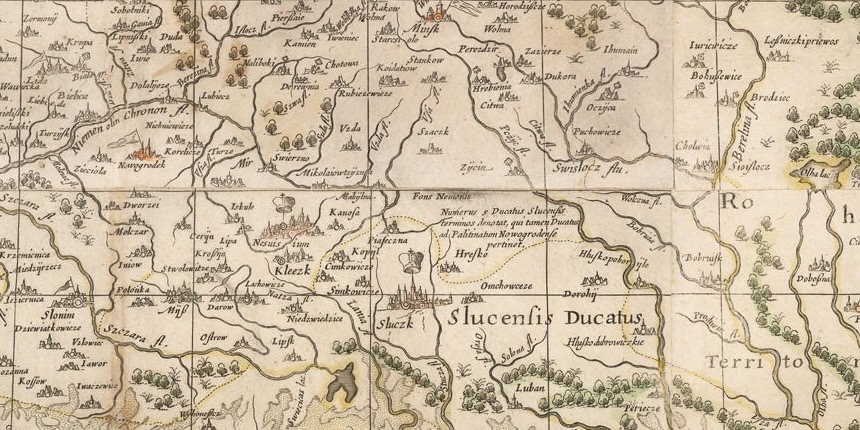 Fragment mapy z roku 1647. Taturowie w wieku XVI i XVII żyli w księstwie słuckim, oznaczonym na mapie jako Slucensis Ducatus. Ich ziemie leżały w Puszczy Starzyckiej, nieco na południowy wschód od widocznego na mapie miasteczka Piaseczna.